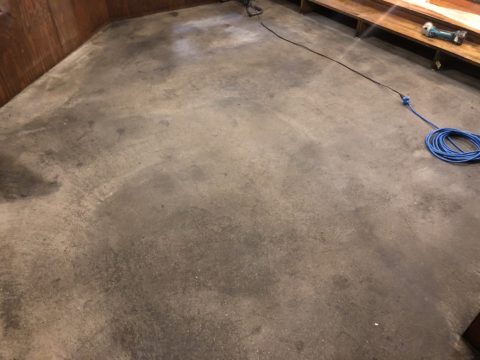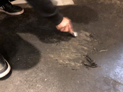 施工前です!油物を多く提供されてる店舗様で油分が床に付着し、そこにさらに埃等が付着して黒くなってしまっています!