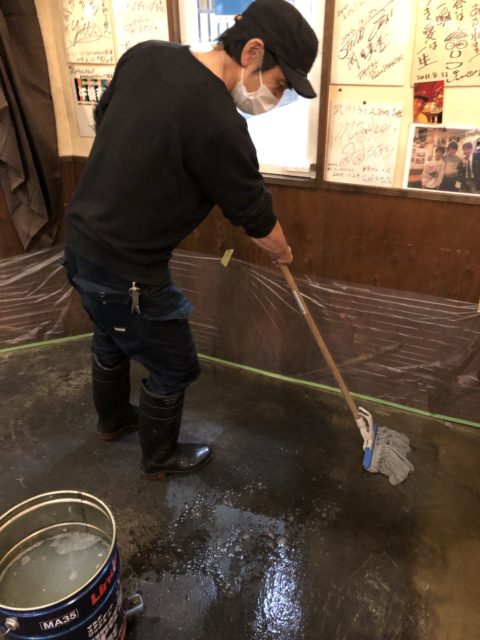 厚みがある程度取れたらお次は洗剤をモップで塗っていきます!たっぷり塗ります!