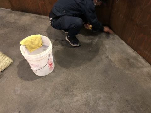 1度では落ちないので、洗剤塗布→ポリッシャー→清水→拭き取り、の作業を落ちなくなるまで繰り返し施工します!