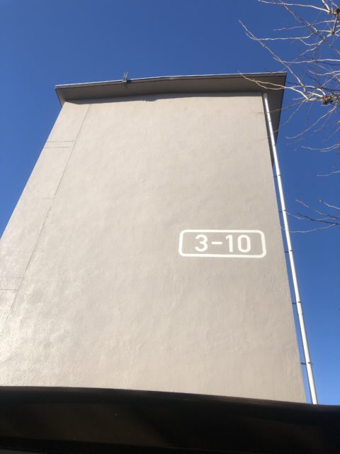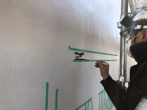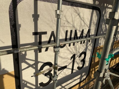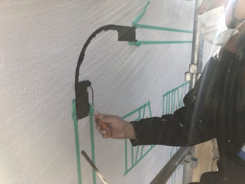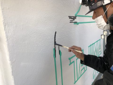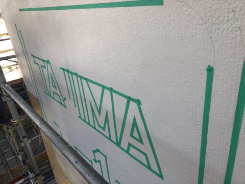 貼り付けが終わりましたら、壁面に文字のラインが付くので、直線のところはテープでマスキングして、作業効率をあげていきます!
