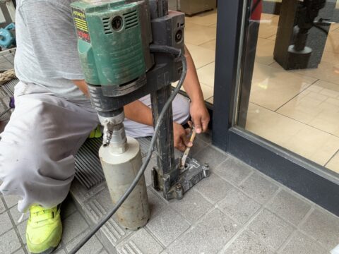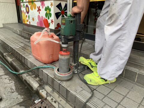 まずは手すりの柱を付けるためにコアリングという穴あけをする準備です!